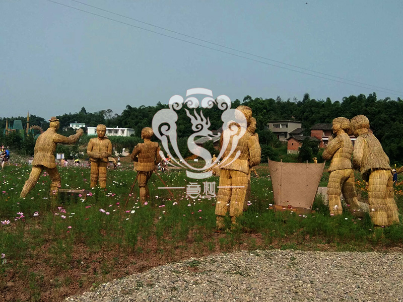 現(xiàn)在的精致稻草人藝術(shù)通常是由專業(yè)美術(shù)老師的造型放樣,然后由焊工師傅焊接出立體造型造型,然后以稻草或者稻草繩為材料編捆制作而成。