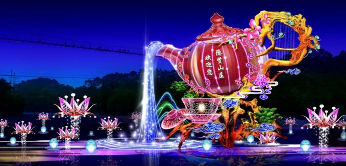 在一組名為《山莊風韻》的燈光造型中,頗受歡迎,隱賢山莊素有聚賢的含義,該燈組采用山莊聚賢的含義制作而成,也有“有朋自遠方來,不亦樂乎”的古韻,歡迎四方的朋友前來隱賢山莊游玩。茶壺手柄以古老樹枝為元素設計而成,一壺香茶流淌,展現出隱賢山莊的古色古香。